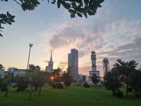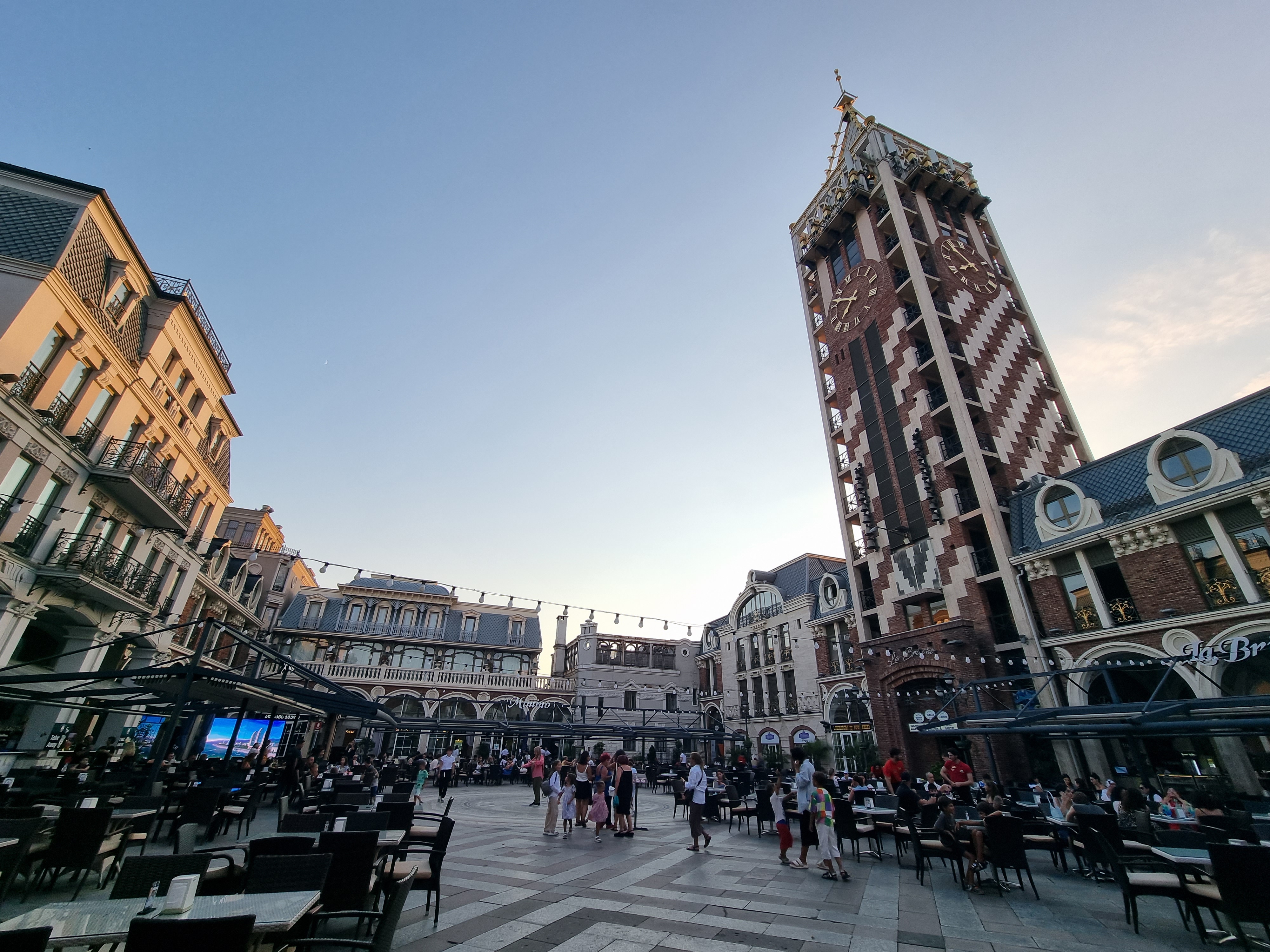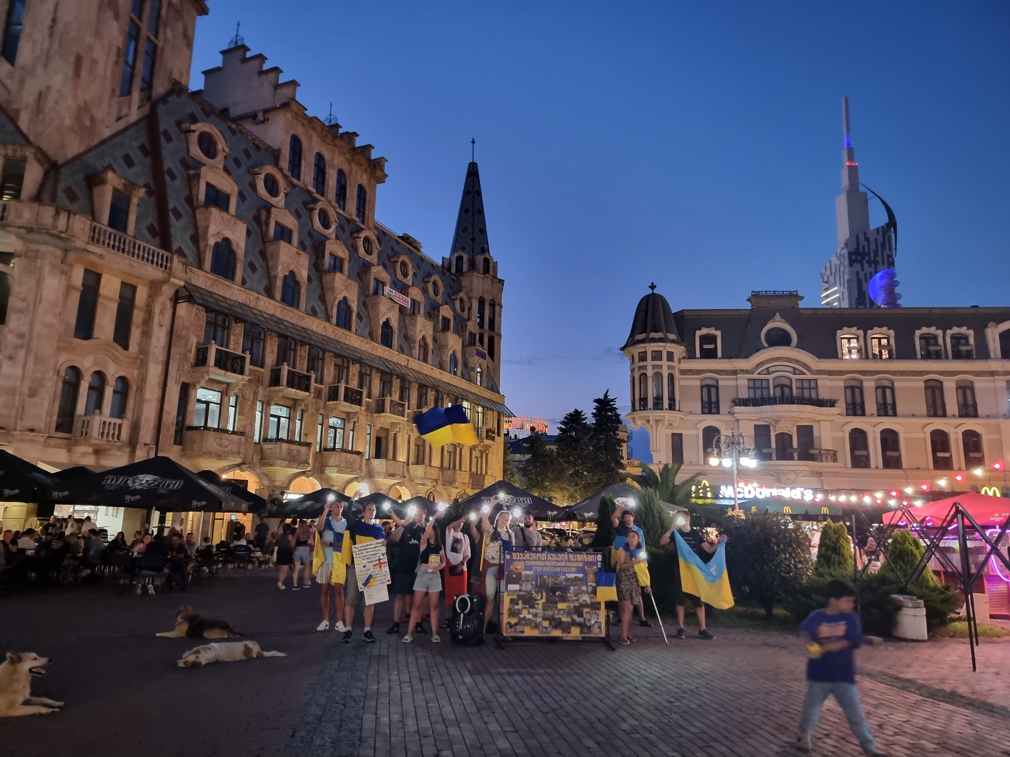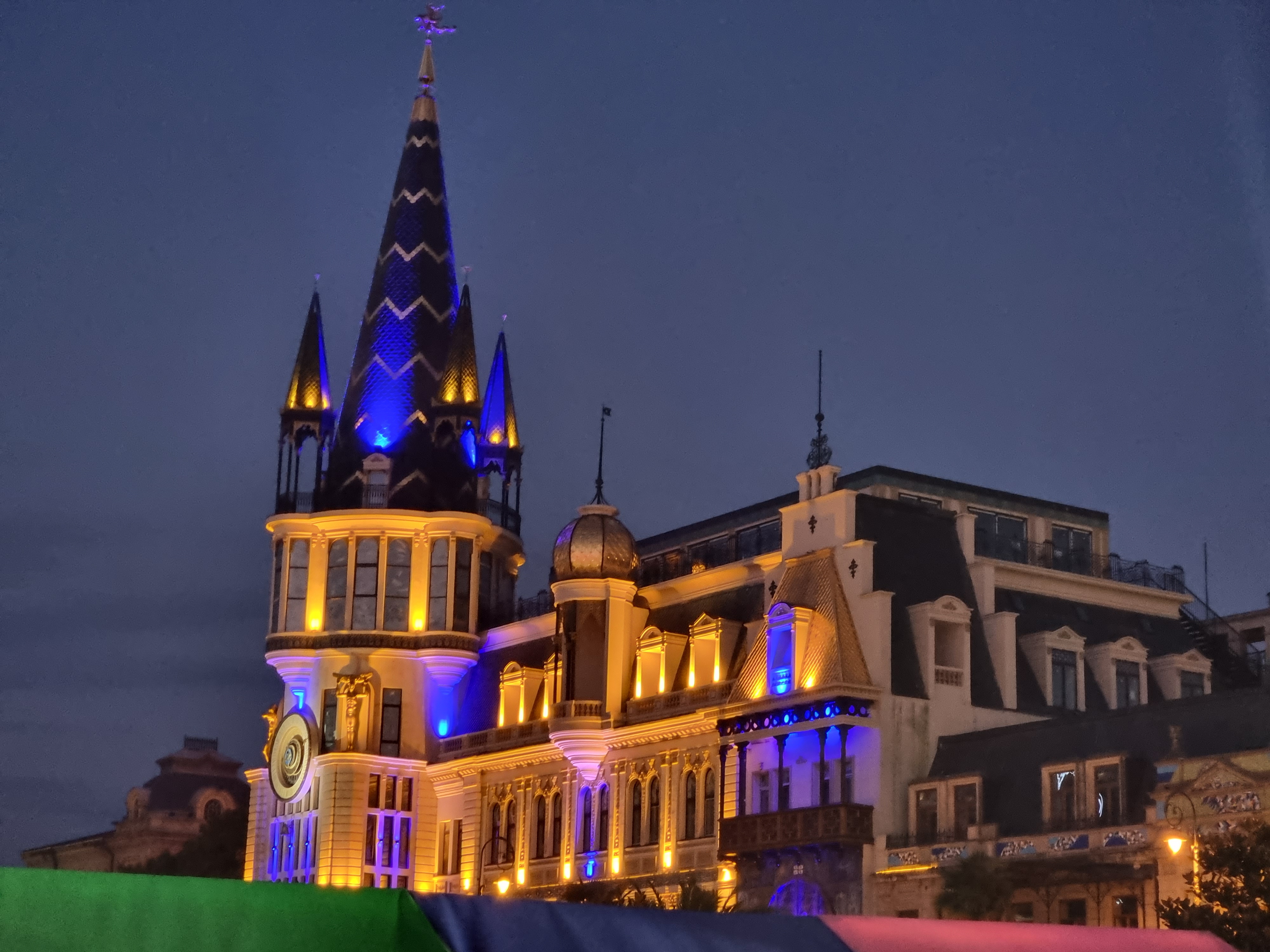 The city centre is a mish mash of different architectural styles, though primarily something close to 19th century central European style, a bit like Vienna. Some of these buildings are being restored, which means there are still a lot of run down ones, as well as some of the Soviet era tenements I mentioned in the previous entry. There are also two squares in the centre: one is simply called Batumi Piazza, named in an Italian style because it was built in 2009 to look like a real Venetian piazza. It was quite odd to see Italian architecture in the middle of the city, though the piazza was nice enough, with restaurants and a stage ready for live music later on. The second square is called Europe Square and appropriately features the central European architecture I just mentioned. We stopped for dinner in this latter square, which was bustling with restaurants set up with outdoor seating for the lovely warm evening. In the middle of the square there was a group of Ukrainians singing and waving flags to raise money for medical supplies in Ukraine, and one of the buildings behind them on the square was lit up in blue and yellow to complement the event. There was also a very high quality market with local people selling lovely hand made items such as elaborate and unique looking handbags, clothes, and wooden sculptures.