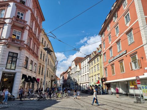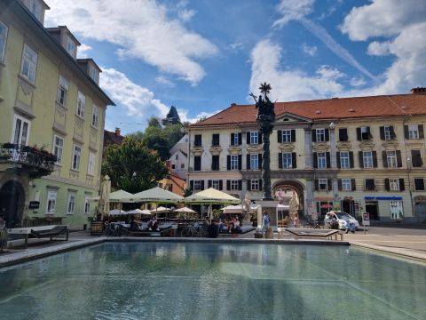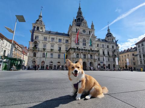 As for today, we left Budapest bright and early at 8am since we had a lot of driving to do to get to our hotel near Lake Bled for the night. There are a few different ways to drive from Budapest to Lake Bled, and we opted for one which took us through the east of Austria since we haven't been to that part of Austria before. This route was the more expensive option though since it meant we needed to buy both an Austrian motorway vignette (€10 for 7 days) and a new Slovenian one (€15 for 7 days) rather than just a Slovenian one. It was refreshing to cross the border from Hungary to Austria without even stopping after all the hours waiting at different borders the last two months! Once in Austria we stopped for a late lunch at the country's second city of Graz. This was pretty much exactly what we expected from a second city of Austria, with the same architecture as Vienna, and a similar vibe with the streets being rather peaceful, well kept and clean. The city straddles the Mur river which we'd never heard of, and has a hill right in the centre with an old clock tower on top. We were going to have some schnitzel but couldn't quite find the right place with reasonable prices and dog friendly seating - some schnitzels cost €25 which we thought was a bit much for a lunch. Instead we opted for some wurst (hot dogs) at the market in the central square which were of course delicious given we are in a part of the world famous for its sausages!