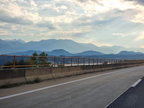 Once we'd finished in Graz we hit the road for the last part of the drive to Bled. This was when finally after some very boring scenery on recent drives, we started to see something interesting again for this stretch. We left behind the flat plains of Central/Eastern Europe and started to reach the edge of the Alps in Austria. This meant hills that eventually became mountains in the distance and by the Slovenian border. We aren't quite in the Alps-proper yet (we'll get there tomorrow), but these are definitely mountains and worthy of a few photos along the way. As expected given we are now in Western Europe, the motorway was impressive and took us on many raised stretches across valleys and through tunnels. The final part of the drive as we crossed the border between Austria and Slovenia was through the 8km long Karawanks Tunnel which crossed the mountain range dividing the two countries, though cost €7.50 in an additional toll not included in either country's vignette which we thought was a bit cheeky.