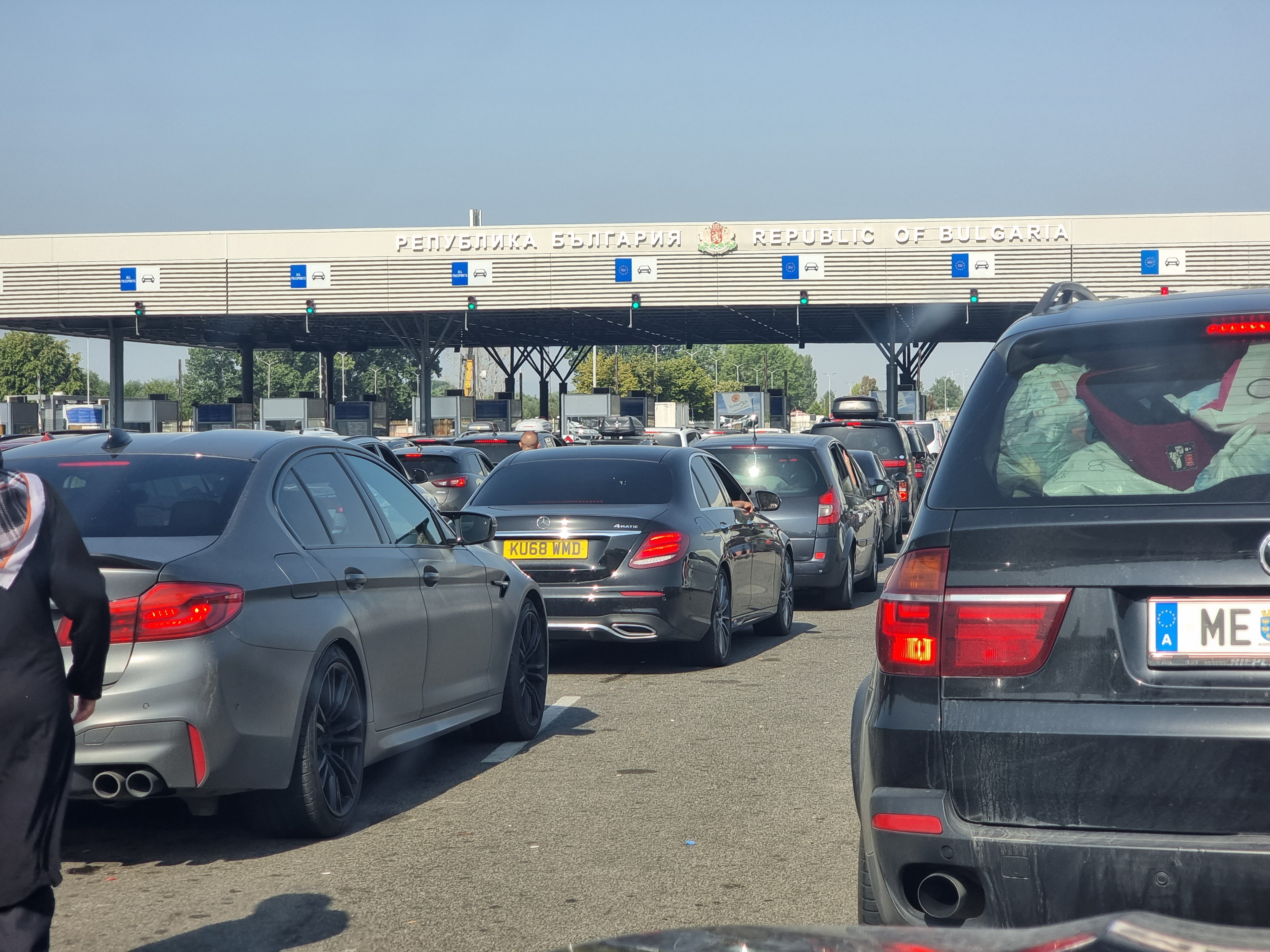 After leaving the Turkish area, the next thing we had to do was drive through a lane which sprayed disinfectant all over the car as we went by. The nearby signs informed us this was to prevent African Swine Fever, which apparently can be brought on cars from Turkey into Bulgaria and affects pigs and boar. Reading online this evening it seems this has been quite an issue for Bulgaria in the past, and they therefore are doing their best to keep it out of the country. Slightly frustratingly there was a manned booth right after the disinfectant lane where we were asked to pay €5.57 for the privilege of the spray down, and of course they only took cash. We paid up and then moved on to another selection of car queues, where we decided to take the right-hand lane after previously taking the left-hand lane on the Turkish side. This turned out to be a good lane, and it only took 30 minutes to get to the front of this one. The Bulgarian passport control was simple enough, and we weren't asked for any car insurance papers as we had been when we entered the EU to Greece from Albania. We then had to face Bulgarian customs which was a bit of a pain. First they did a standard "open the boot" check, had a look at Summer in the back of the car, and then asked me for our passports. The man asked me what we were doing in Turkey, and when I told him we had travelled all around and been to Georgia and Armenia he looked a bit suspicious and asked what my job is. I told him and he then asked if I have tobacco or alcohol, to which I confirmed we only had a little bit of gin in the boot. He then asked if I have any drugs, to which I smiled and said no. He also smiled and said "are you sure?", and I confirmed with a promise that I didn't have any drugs. He let us go, and thinking that was the end of it, we drove on to another final barrier where most people were being let through into Bulgaria, but some cars were being stopped and asked more questions. Unfortunately we were stopped (Melisa thinks this was because the official saw me using my phone), and the official looked annoyed and told us we cannot pass and must go back to the previous customs officials. We had to reverse back about 100m to the other officials, who asked why we had come back, and then looked confused when we said we were sent back; we were all having our time wasted it seemed. The official asked the same tobacco, alcohol, drugs question again and then let us return to the final barrier. This time we were waved straight through and we were finally in Bulgaria!
