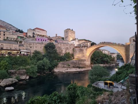 After the tour we hit the road for Mostar, which took us even deeper into the Dinaric Alps past some absolutely beautiful scenery, with the mountains becoming increasingly rugged as we went along. We also drove through a storm, which saw the temperatures drop from about 33 degrees to 20 degrees, though by the time we got to Mostar it was back up to 38 - meaning we get to sample the same heat as everyone back home in London! Because it was so hot we waiting a bit in the airconditioned hotel room for things to cool down, before heading out to explore the old town of Mostar including the famous medieval Stari Most (Old Bridge) which was built in the Ottoman times, destroyed by the Croat army in the Croat-Bosniak war in 1993, and then rebuilt from 2001-2004. It still looks quite new, and has a buzzing bazaar area on either side. We struggled with the buggy on the cobbled stones so Lucy had to be carried rather than bumping all over the place. Once we crossed over, we decided to eat in a tiered restaurant on the side of the gorge (Neretva) which had beautiful views overlooking the river and the bridge. I must mention a delicious main course we shared with was a deep fried minced meat kebab, stuffed with cream cheese - as it sounds, but even better! Though we felt very heavy afterwards.