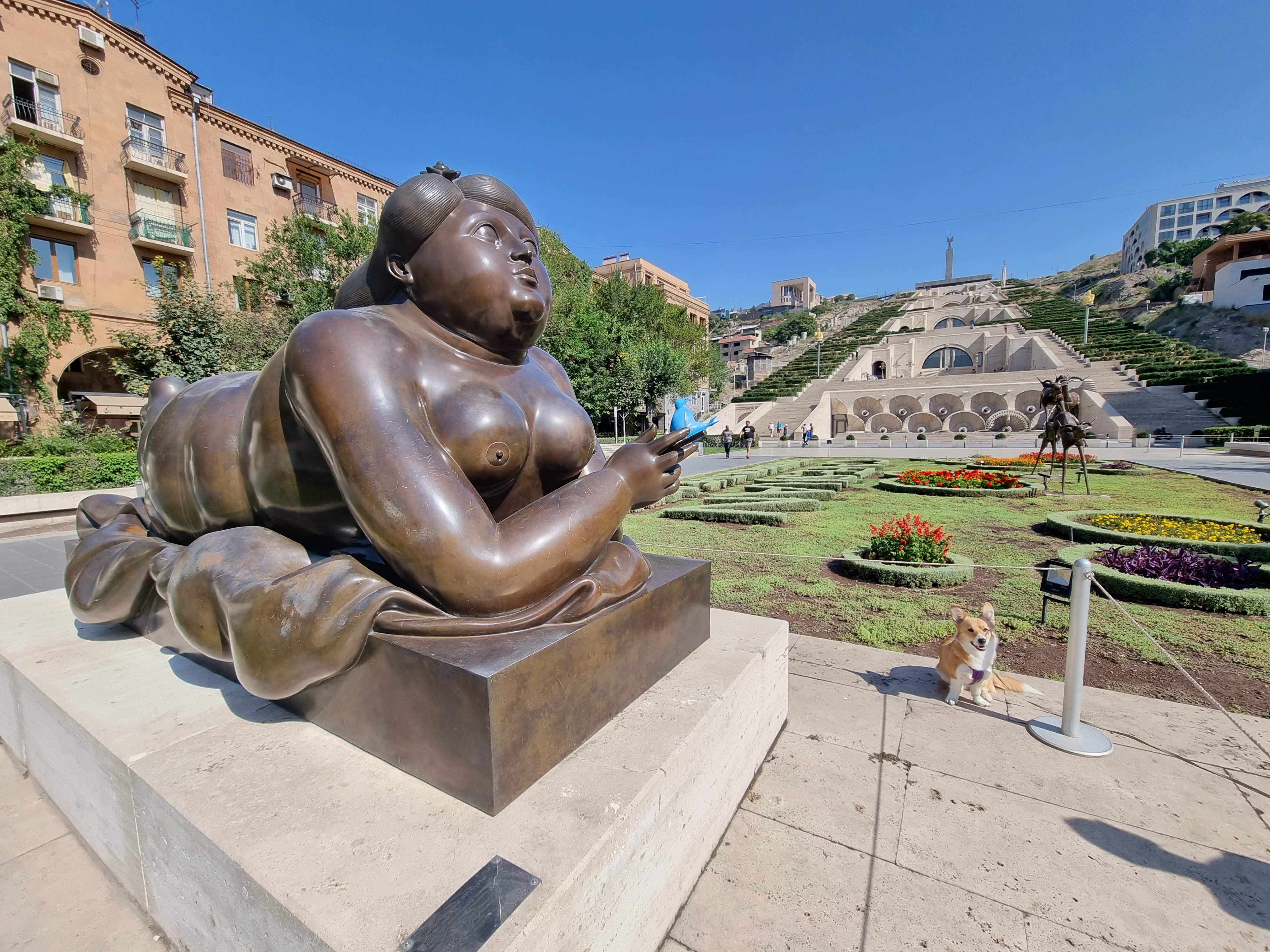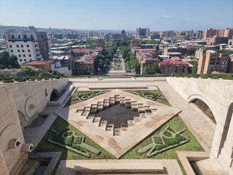 We set off fairly early for an added stop in the centre of Yerevan to make up for having not felt up to exploring much yesterday. This was at the Cascade Complex, which I'd seen by night on the walking tour, but wanted to take Melisa to see in the day. Luckily Yerevan is a city which wakes up very late, so the area had almost no traffic, and you can actually drive up to and park right in front of the Complex before 11am. I've no idea when morning rush hour is in Yerevan but it certainly was nowhere to be seen at 9.30am on a Wednesday morning! The Cascade Complex itself is a huge limestone staircase monument which is built onto a hillside in the city centre, and features fountains, sculptures and gardens representing the whole of the country. The whole thing was built in the 1970s but remains unfinished due to the Soviet Union running out of money to complete it. I walked up to the very top and it quite literally ends with a construction fence and you can see a large area of foundation work, before a final statue in the distance which is supposed to be connected. The guide the other day told us the city keeps putting off plans to fund the completion due to ongoing war efforts against Azerbaijan. At the top I had great views out over the city, though have to say it doesn't have a particularly picturesque skyline - it is much better from ground level.