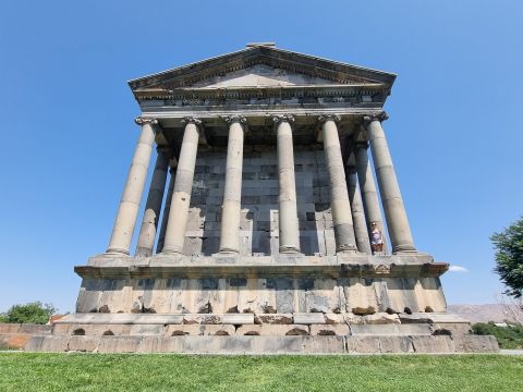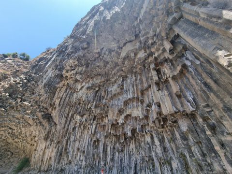 Our next stop was 45 minutes drive to the East of the city to the Temple of Garni. This is a Greco-Roman temple which we heard is the most Eastern example in the world. It had been completely destroyed in an earthquake in 1679, but was painstakingly rebuilt in the 1970s using all the original blocks and techniques which the Romans would have used 2000 years ago. The temple is an impressive structure, and sits at the top of a ravine with views all around into the canyon below. Tickets only cost £3 for foreign adults, which was probably about right given there wasn't much to do other than take pictures and read a few signs - we were back at the car within 30 minutes. Completing the sights in this area, we then drove for 10 minutes down to the Garni Gorge below, where we stopped to see the Symphony of Stones. They made us pay 200 Dram (40p) to walk to the stones which seemed a bit pointless, but we obliged and were immediately amazed by what we could see a few hundred metres away. The valley walls on the right side of the gorge are made up of hexagonal columns of stone, which hang above a bit like the pipes of an organ (I'm guessing that's where the 'symphony' in the name comes from). Apparently it is one of only three places in the world with natural hexagonal rock formations, the others being the Giant's Causeway in Northern Ireland and the other being in Iceland. Given we haven't been to either other location, this was a really unique experience for us and we were very impressed!