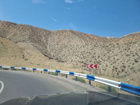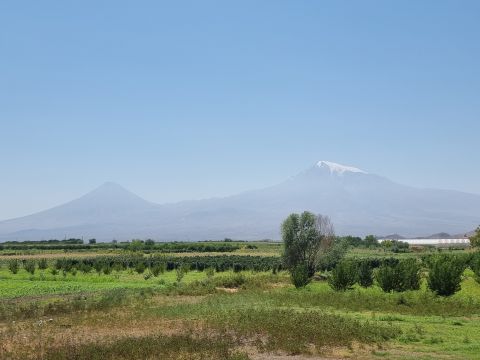 With Garni complete, the rest of the afternoon was spent doing the roughly four hours of driving to Tatev. The first hour of the drive took us through low mountains with an almost barren desert landscape similar to something you might expect to see in the South-West of the USA or near the Andes in Argentina. This was a very fun bit of driving, and gave us the feeling we were a very long way from home! We then turned onto a main road parallel with the closed border with Turkey, where the land turned green again and where we could see the impressive Mount Ararat not too far away. The mountain is close to the hearts of the Armenians being in their historical lands which are now part of modern Turkey, and the guide the other night explained the conical shape of the mountain is theorised to have influenced the conical shapes used in the church domes here. We then turned off this road where the landscape quickly turned from green to yellow steppe and near barren again like earlier in the day. It also took us rather near the border with the Azerbaijani exclave of Nakhchivan which made me recall the news of recent tensions at the border - not a place we hung around for too long. In this area though we started seeing apricot sellers on the side of the road. Having heard about how Armenian apricots are the best in the world, we stopped to buy 4 large ones (40p total) and ate them in the village of Vayk while we topped up the car's battery. As anticipated, they were sweet, juicy, and probably the best we have ever had.
