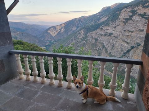The last 45 minutes of the trip saw the landscape go yellow again (we quite literally saw the last green patch below they all became yellow), and I was starting to wonder when the rugged mountainous landscape I had heard about around Tatev would turn up. Sure enough it did around 10 minutes before we arrived at our hotel, with us suddenly descending down a mountain road on the side of a canyon, looking fairly similar to what we saw earlier in the trip at Vikos. Our hotel for the night is right on the edge of the canyon and the views couldn't be better of this remote location.