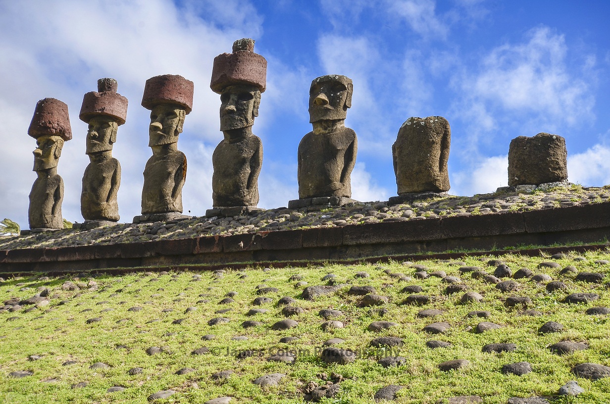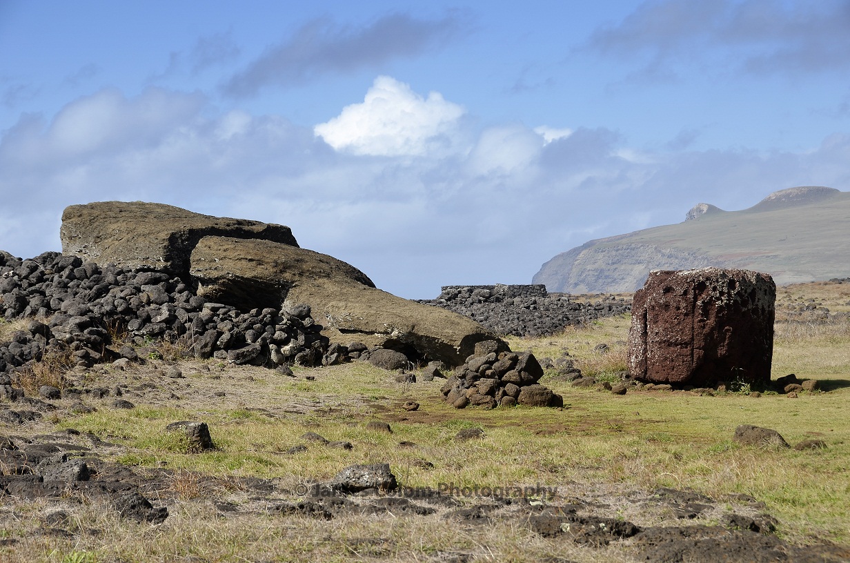 Just a short drive further, and I got my first glimpse of Ahu Tongariki in the distance. This is one of the most striking sights on the entire island, with 15 Moai erected on the largest ceremonial platform in the whole of Polynesia. The Moai are of varying condition, and only one has had its topknot (the red hair/hat I referred to yesterday) replaced. The other topknots are lying on the ground next to the platform. The interesting thing about this Ahu is that a Japanese company paid for it to be restored due to Easter Island being very popular over there. This process would have been much simpler had it not been for a tsunami in 1960 washing some of the Moai tens of metres from their original falling spots. Once the restoration was complete, a 16th Moai (which now stands close to the Ahu) was sent to Japan for exhibition as a thank you – it is now known as the ‘Travelling Moai’.