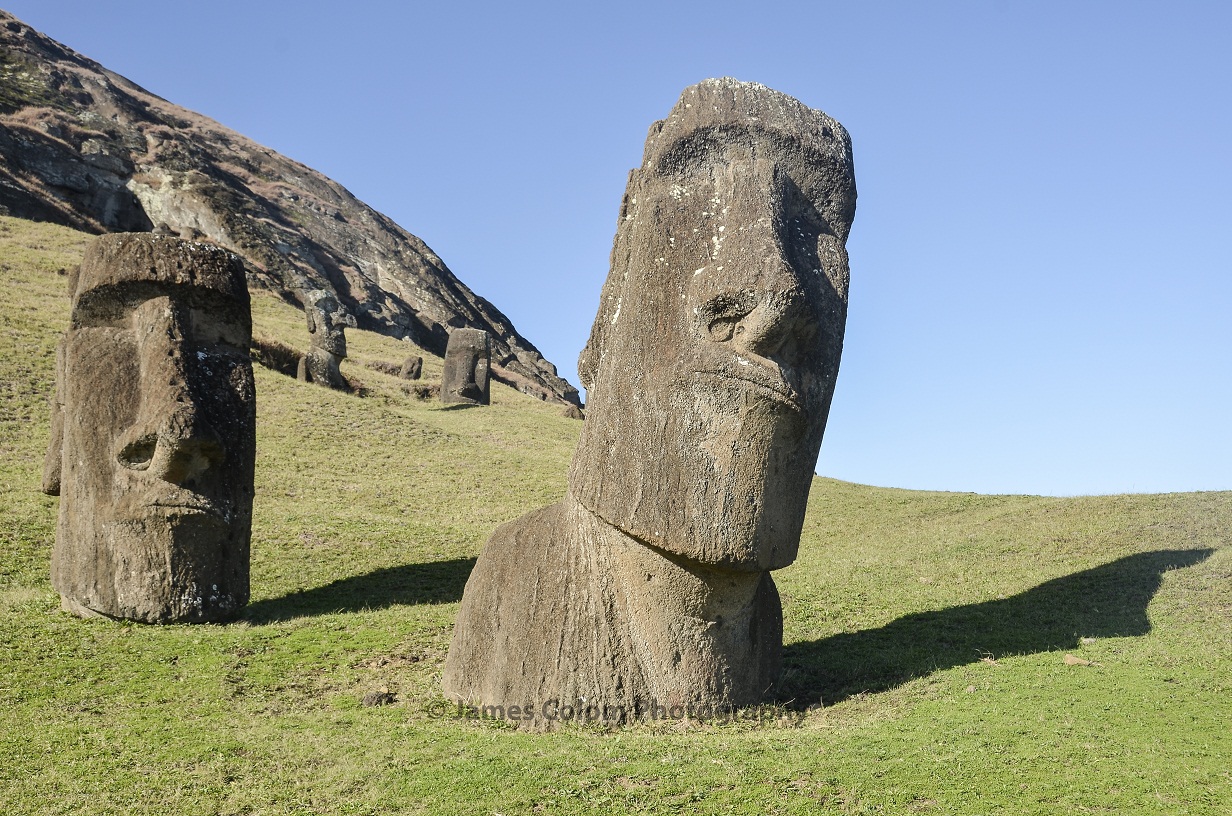 After the crater, I visited the main quarry on the outside slope of the volcano. There are almost 400 Moai here, in various stages of carving and movement. Each Moai is exactly as it was when abandoned around 200 years ago, and to this day no one really knows why the sculptors decided to simply cease what they were doing one day. However, when they did cease, the earth they had displaced slowly moved back down the mountain, covering the Moai in transit, so today you can mostly only see the heads sticking out of the dirt. It’s a truly fascinating sight, and highlights included the largest Moai ever carved (it was huge – I couldn’t quite believe it), and staring up at the mountain to make out faces and bodies in the early stages of creation. It is truly an eerie sight to think these people spent their entire lives carving the Moai, only to abandon them in what has now become a Moai graveyard.