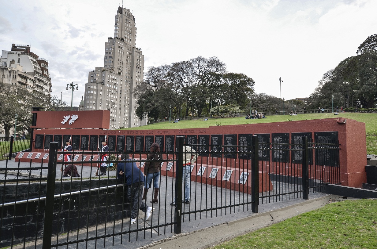 Photos of the day: the Argentinian flag flying in the Plaza de San Martin, and the Malvinas War memorial.