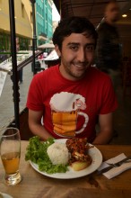 From the park it was only a short walk over to Plaza Mayor, which is one of the two main squares of the city. The square is traditionally considered to be the centre of the city, and is the place where the city was founded in 1535. It is surrounded by grand buildings, including the city's cathedral and a number of palaces. Due to it being independence day, most of the square was taken up by an outdoor festival, which featured singers and traditional dancer. While taking all this in, we were lured into a bar on the square by a man who admired the beer on Marc's tshirt, and rightly guessed we were both willing to drink one. Here, Marc sampled one of the local delicacies: Cuy, which is what we commonly call guinea pig. Marc ate the majority of it, though I had a bite just so I can say I tried it. We both decided that despite it sounding cliche, it more or less tasted like chicken - something we are both rather familiar with!